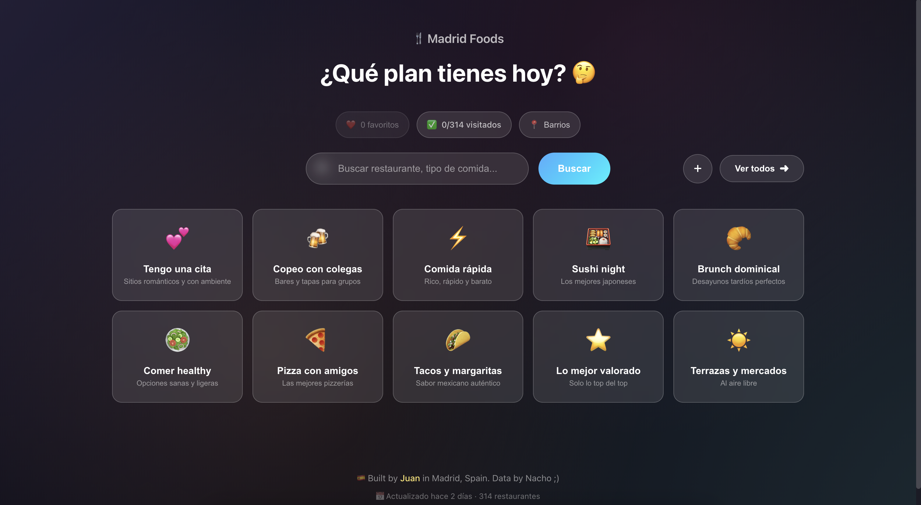 One-day personal project to display a list of restaurants in Madrid that my friend Nacho shared with me. With MadridFoods, you can find the best places to go in Madrid based on your plans, location and other preferences.